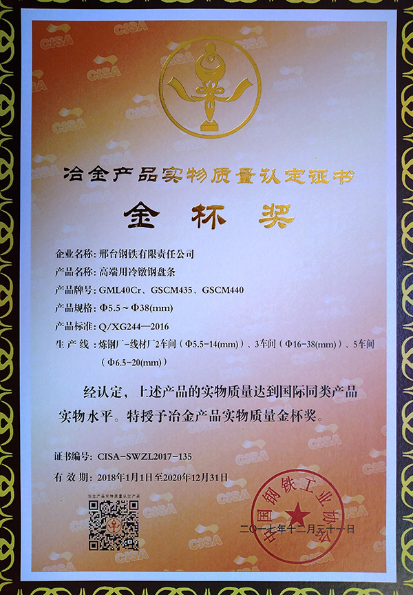 高端用冷鐓鋼盤條GML40Cr、GSCM435、GSCM440Φ5.5~Φ38(mm)獲冶金產(chǎn)品實物質(zhì)量金杯獎