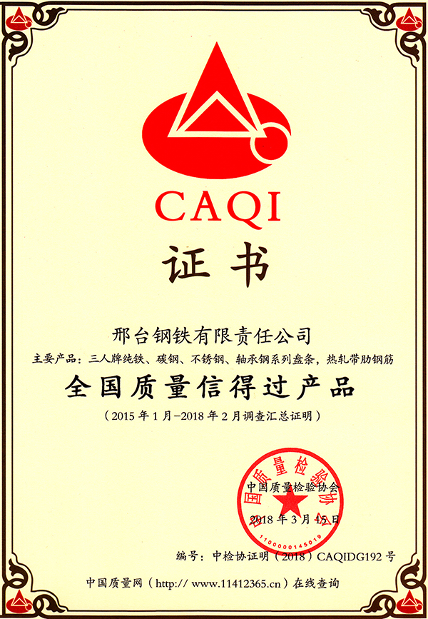 三人牌純鐵、碳鋼、不銹鋼、軸承鋼系列盤條,熱軋帶肋鋼筋獲全國質(zhì)量信得過產(chǎn)品