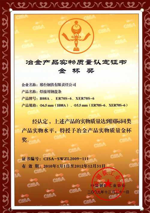 焊接用鋼盤條H08A、ER70S-6、XER40S-6獲冶金產(chǎn)品實(shí)物質(zhì)量金杯獎
