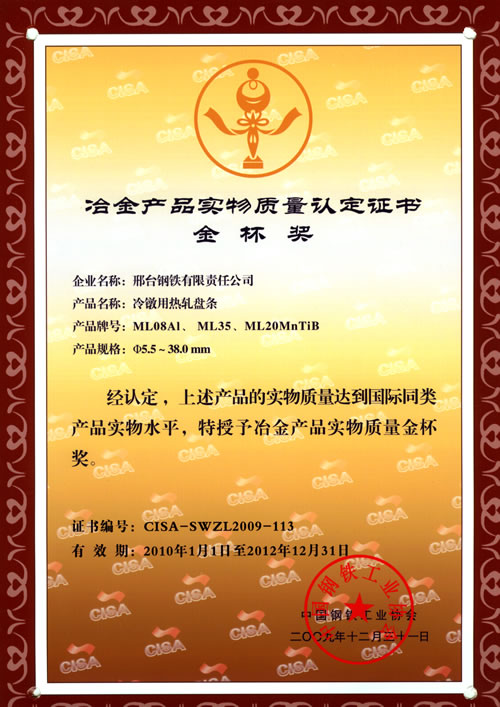 冷鐓用熱軋盤條ML08AL、ML35、ML20MnTiB獲冶金產(chǎn)品實(shí)物質(zhì)量金杯獎