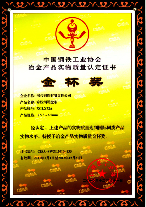 簾線鋼用盤條XGLX72A獲冶金產(chǎn)品實(shí)物質(zhì)量金杯獎