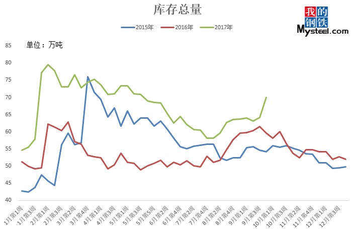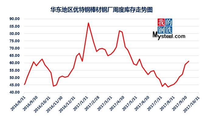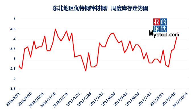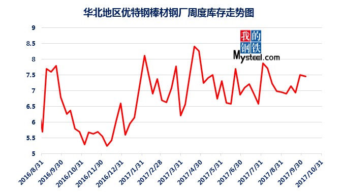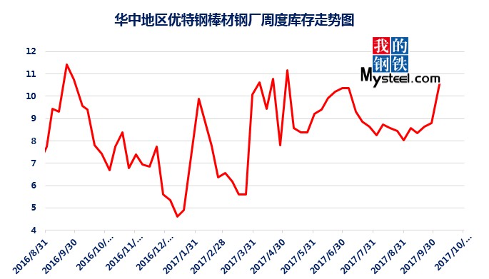 據(jù)mysteel統(tǒng)計的樣本優(yōu)特鋼廠庫存顯示,現(xiàn)全國優(yōu)特鋼廠棒材總庫存86.92萬噸,較國慶節(jié)前增加5.67萬噸,環(huán)比增加6.5%,較2016年國慶節(jié)后第一周庫存低0.31萬噸,較2016年均值高9.61萬噸,上漲12.43%。2017年內(nèi)均值為84.43萬噸,當前庫存較均值增加2.49萬噸。樣本鋼廠總庫存連續(xù)7周上漲。