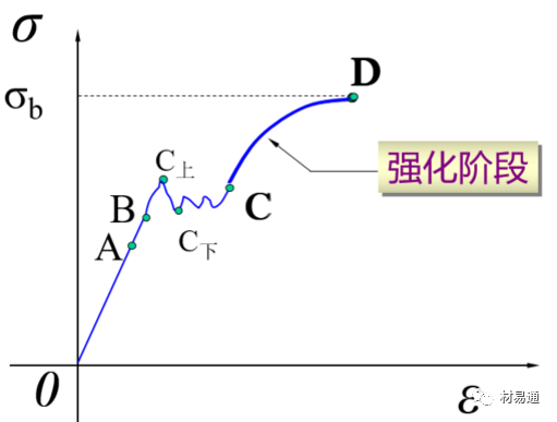 經(jīng)過屈服階段后,曲線從C點又開始逐漸上升,說明要使應(yīng)變增加,必須增加應(yīng)力,材料又恢復(fù)了抵抗變形的能力,這種現(xiàn)象稱作強化,CD段稱為強化階段(加工硬化)。