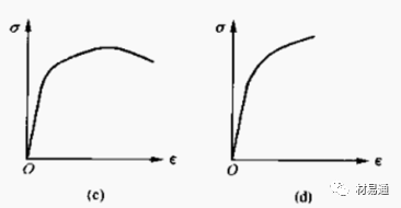 c是淬火后低、中溫回火鋼的應(yīng)力-應(yīng)變曲線,它無可見的屈服階段,均勻塑性變形后產(chǎn)生縮頸,然后試樣斷裂;