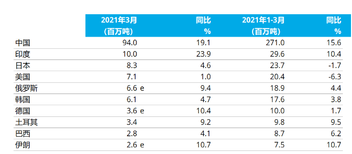 2021年1-3月粗鋼產(chǎn)量累計(jì)前十位的國(guó)家