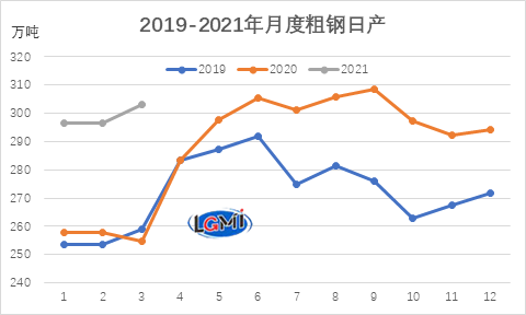 圖2 2019-2021年各月粗鋼日產(chǎn)變化