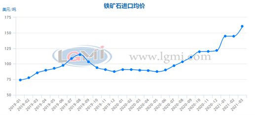 一季度鋼鐵原料價格明顯上漲。據(jù)蘭格鋼鐵云商平臺監(jiān)測數(shù)據(jù)顯示,一季度海關(guān)進口鐵礦石均價為150.8美元/噸,較2020年一季度上漲66.4%;唐山二級冶金焦均價為2560元/噸,較2020年一季度上漲39.1%;唐山重廢均價為3081元/噸,較2020年一季度上漲23.5%。在原料價格上漲帶動下,鋼鐵生產(chǎn)成本大幅上漲,據(jù)蘭格鋼鐵研究中心測算數(shù)據(jù)顯示,2021年一季度普碳方坯成本較2020年上漲849元/噸,漲幅達31.3%。