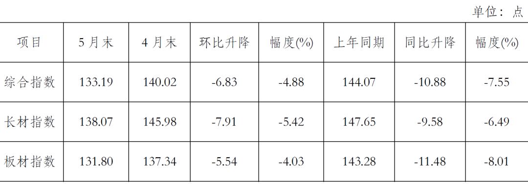 5月末,CSPI長材指數(shù)為138.07點(diǎn),環(huán)比下降7.91點(diǎn),降幅為5.42%;CSPI板材指數(shù)為131.80點(diǎn),環(huán)比下降5.54點(diǎn),降幅為4.03%。與上年同期相比,長材、板材指數(shù)分別下降9.58點(diǎn)和11.48點(diǎn),降幅分別為6.49%和8.01%。(見下表)