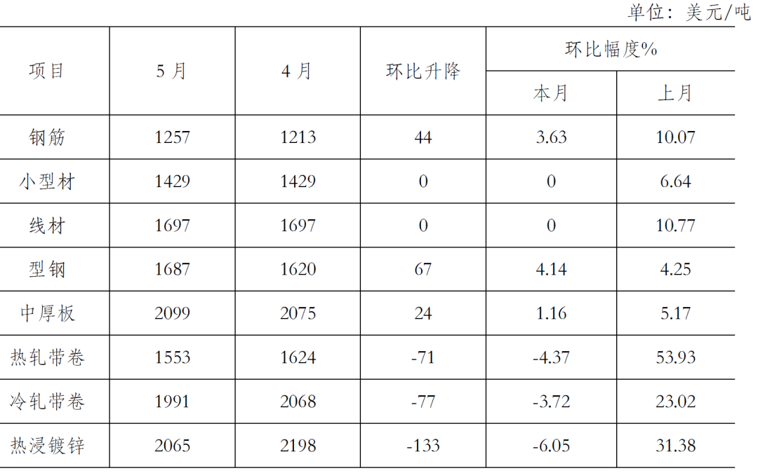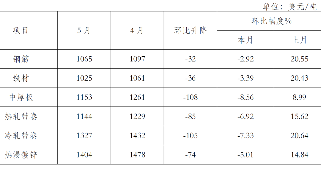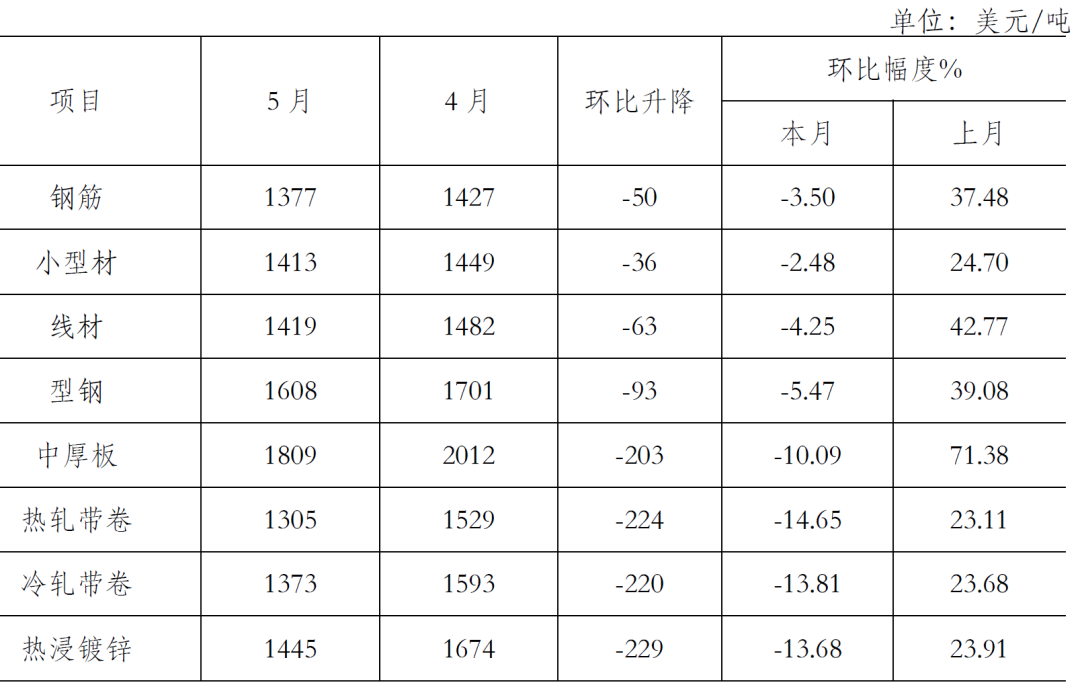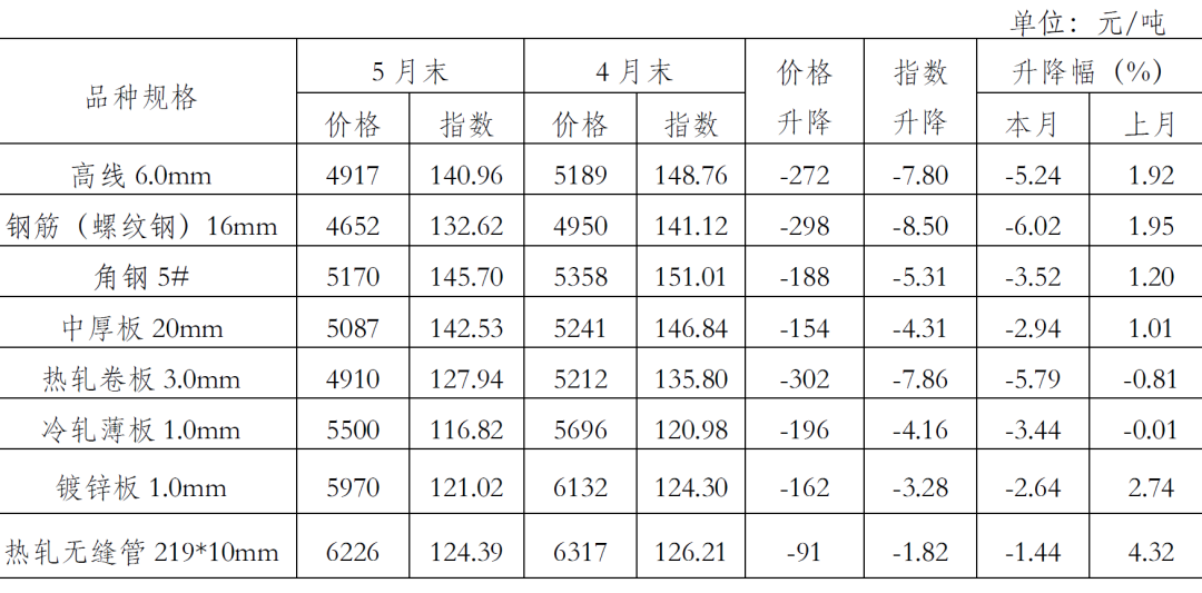 5月末,鋼鐵協(xié)會監(jiān)測的八大鋼材品種價格均有所下降。其中,熱軋卷板和冷軋薄板繼續(xù)下降,且降幅較上月有所加大,環(huán)比分別下降302元/噸和196元/噸;高線、三級鋼筋、角鋼、中厚板、鍍鋅板和熱軋無縫管價格由升轉(zhuǎn)降,環(huán)比分別下降272元/噸、298元/噸、188元/噸、154元/噸、162元/噸和91元/噸。(見下表)