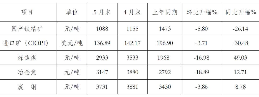 5月末,CIOPI進(jìn)口礦價格環(huán)比下降5.28美元/噸,國產(chǎn)鐵精礦價格環(huán)比下降67元/噸;煉焦煤價格環(huán)比下降600元/噸,冶金焦價格環(huán)比下降733元/噸,廢鋼價格環(huán)比下降150元/噸。原燃料價格雖環(huán)比回落,但總體仍處于高位。(見下表)