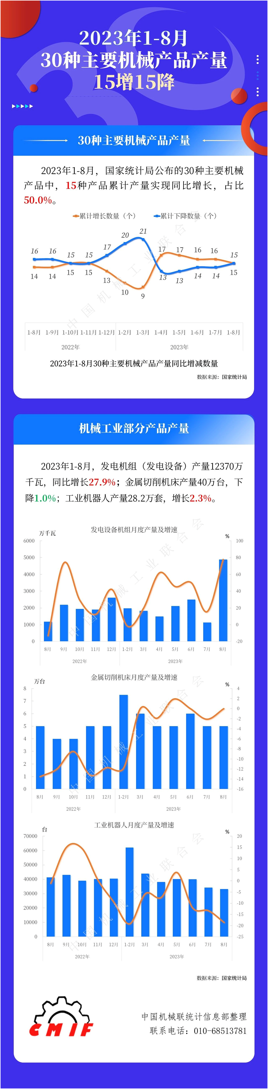 2023年1-8月,國(guó)家統(tǒng)計(jì)局公布的30種主要機(jī)械產(chǎn)品中,15種產(chǎn)品累計(jì)產(chǎn)量實(shí)現(xiàn)同比增長(zhǎng),占比50.0%。