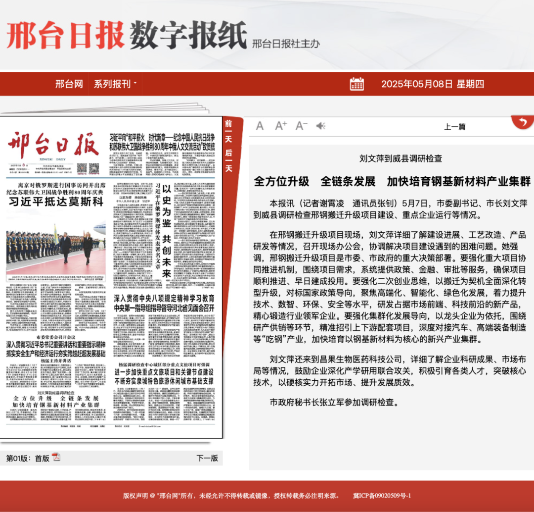 在邢鋼搬遷升級(jí)項(xiàng)目現(xiàn)場(chǎng),劉文萍詳細(xì)了解建設(shè)進(jìn)展、工藝改造、產(chǎn)品研發(fā)等情況,召開現(xiàn)場(chǎng)辦公會(huì),協(xié)調(diào)解決項(xiàng)目建設(shè)遇到的困難問題。她強(qiáng)調(diào),邢鋼搬遷升級(jí)項(xiàng)目是市委、市政府的重大決策部署。要強(qiáng)化重大項(xiàng)目協(xié)同推進(jìn)機(jī)制,圍繞項(xiàng)目需求,系統(tǒng)提供政策、金融、審批等服務(wù),確保項(xiàng)目順利推進(jìn)、早日建成投用。要強(qiáng)化二次創(chuàng)業(yè)思維,以搬遷為契機(jī)全面深化轉(zhuǎn)型升級(jí),對(duì)標(biāo)國家政策導(dǎo)向,聚焦高端化、智能化、綠色化發(fā)展,著力提升技術(shù)、數(shù)智、環(huán)保、安全等水平,研發(fā)占據(jù)市場(chǎng)前端、科技前沿的新產(chǎn)品,精心鍛造行業(yè)領(lǐng)軍企業(yè)。要強(qiáng)化集群化發(fā)展導(dǎo)向,以龍頭企業(yè)為依托,圍繞研產(chǎn)供銷等環(huán)節(jié),精準(zhǔn)招引上下游配套項(xiàng)目,深度對(duì)接汽車、高端裝備制造等“吃鋼”產(chǎn)業(yè),加快培育以鋼基新材料為核心的新興產(chǎn)業(yè)集群。
